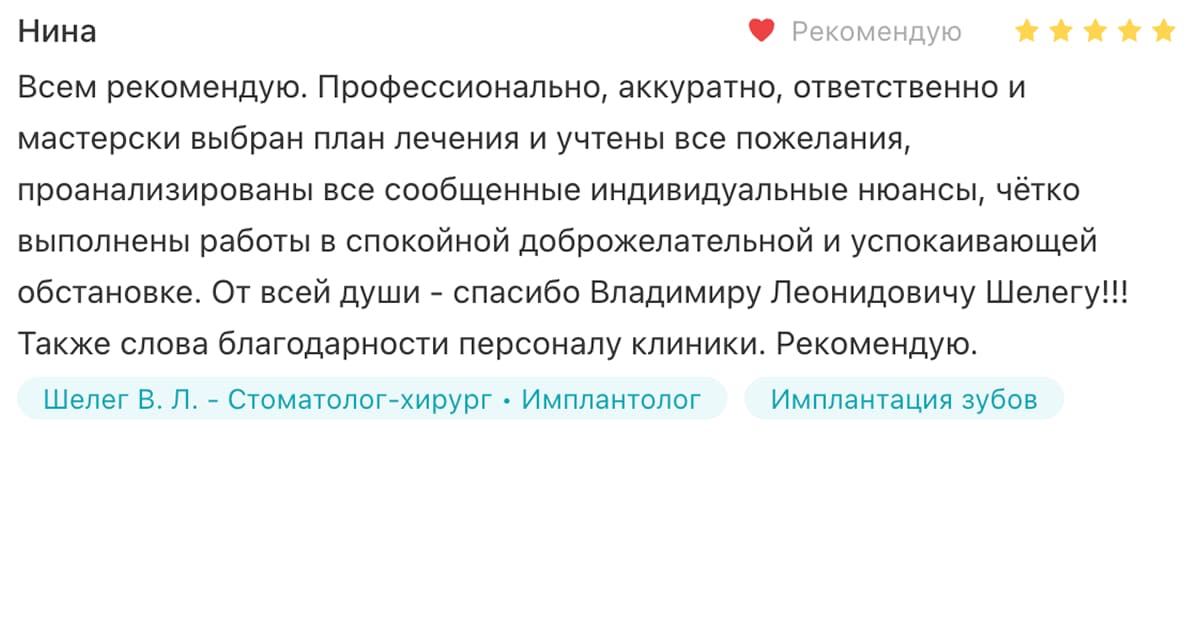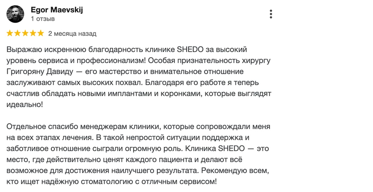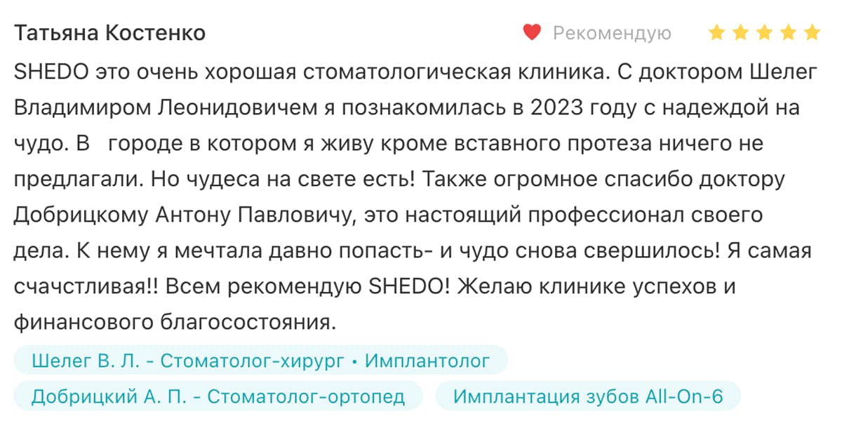 Sign up for consultationReal reviews from patients of the SHEDO dental clinic: clinical cases, reviews and comments from doctors.