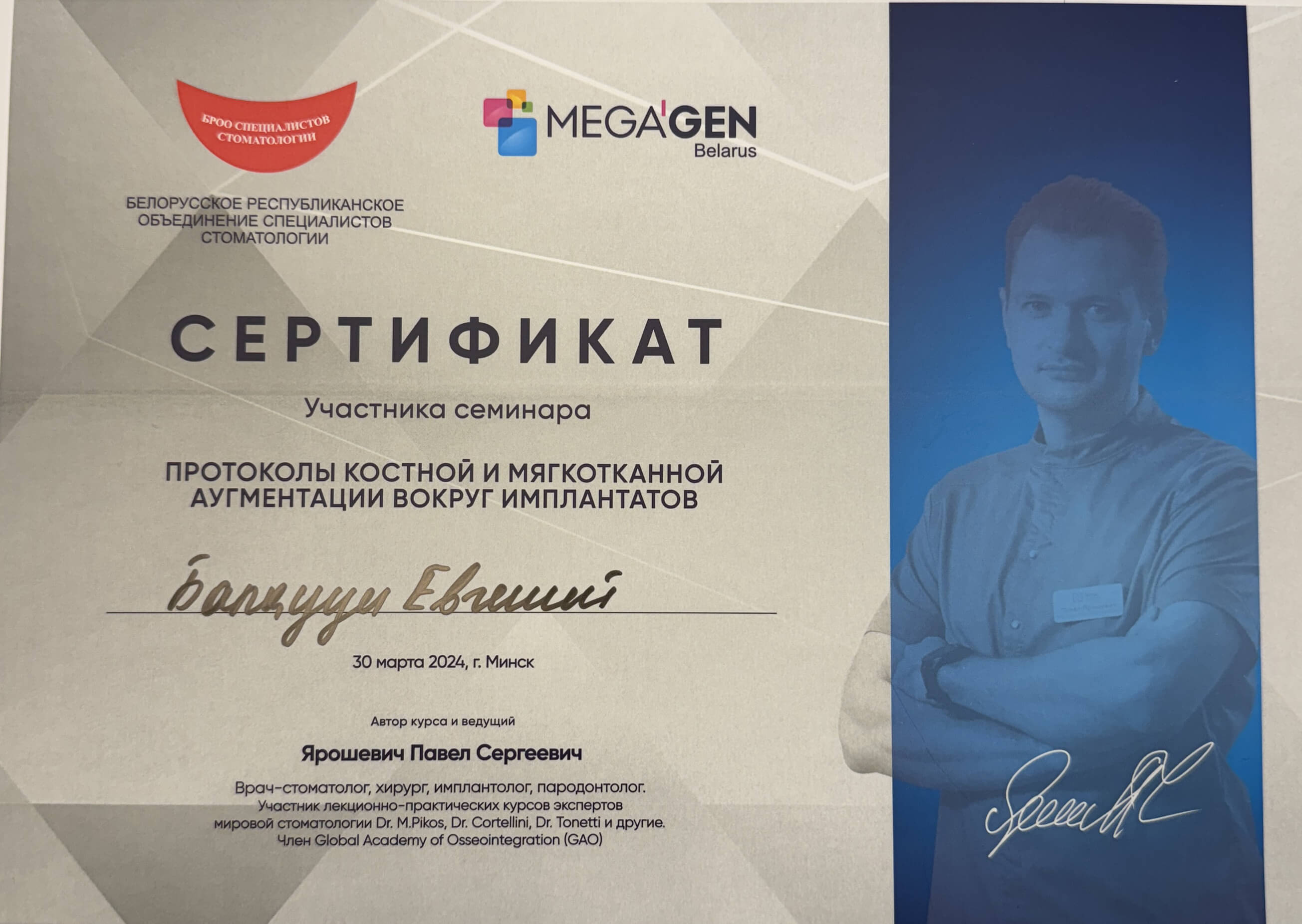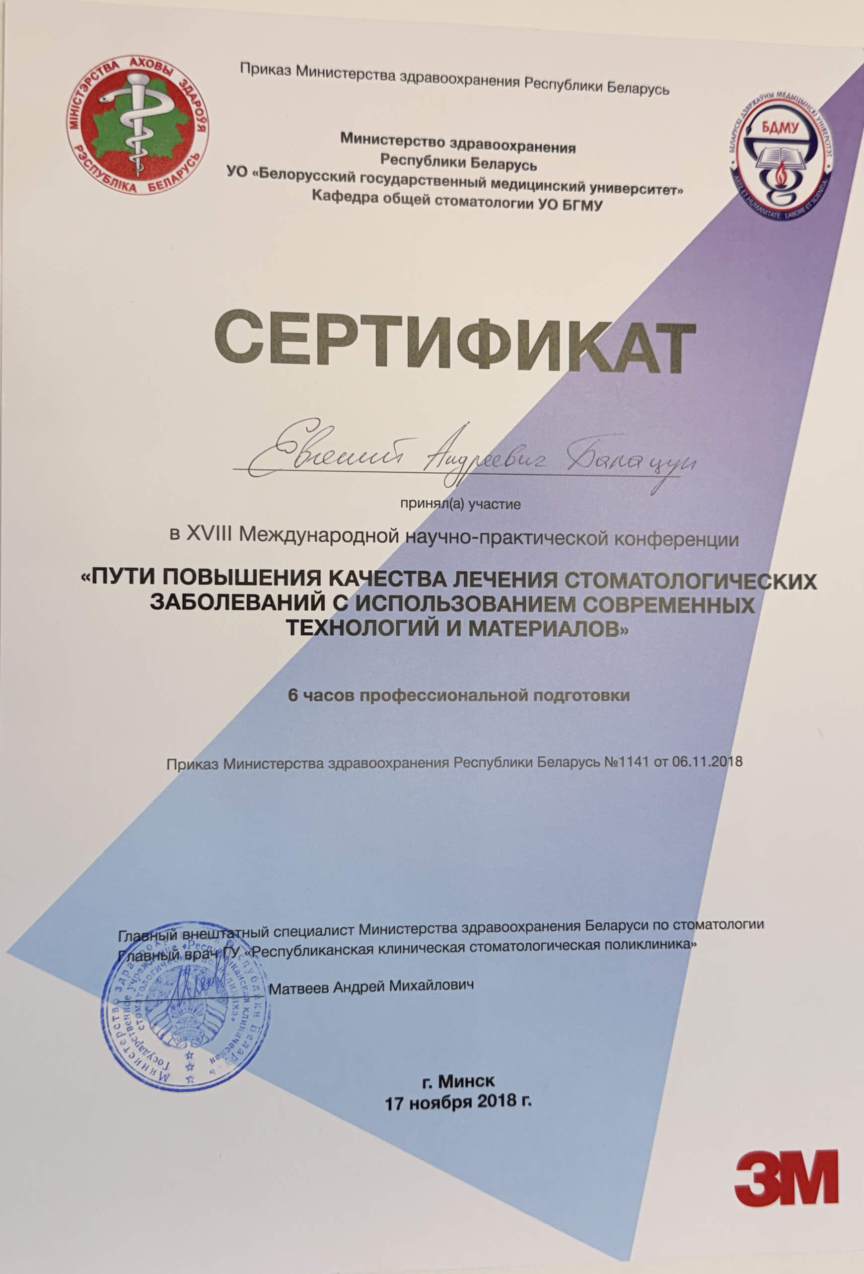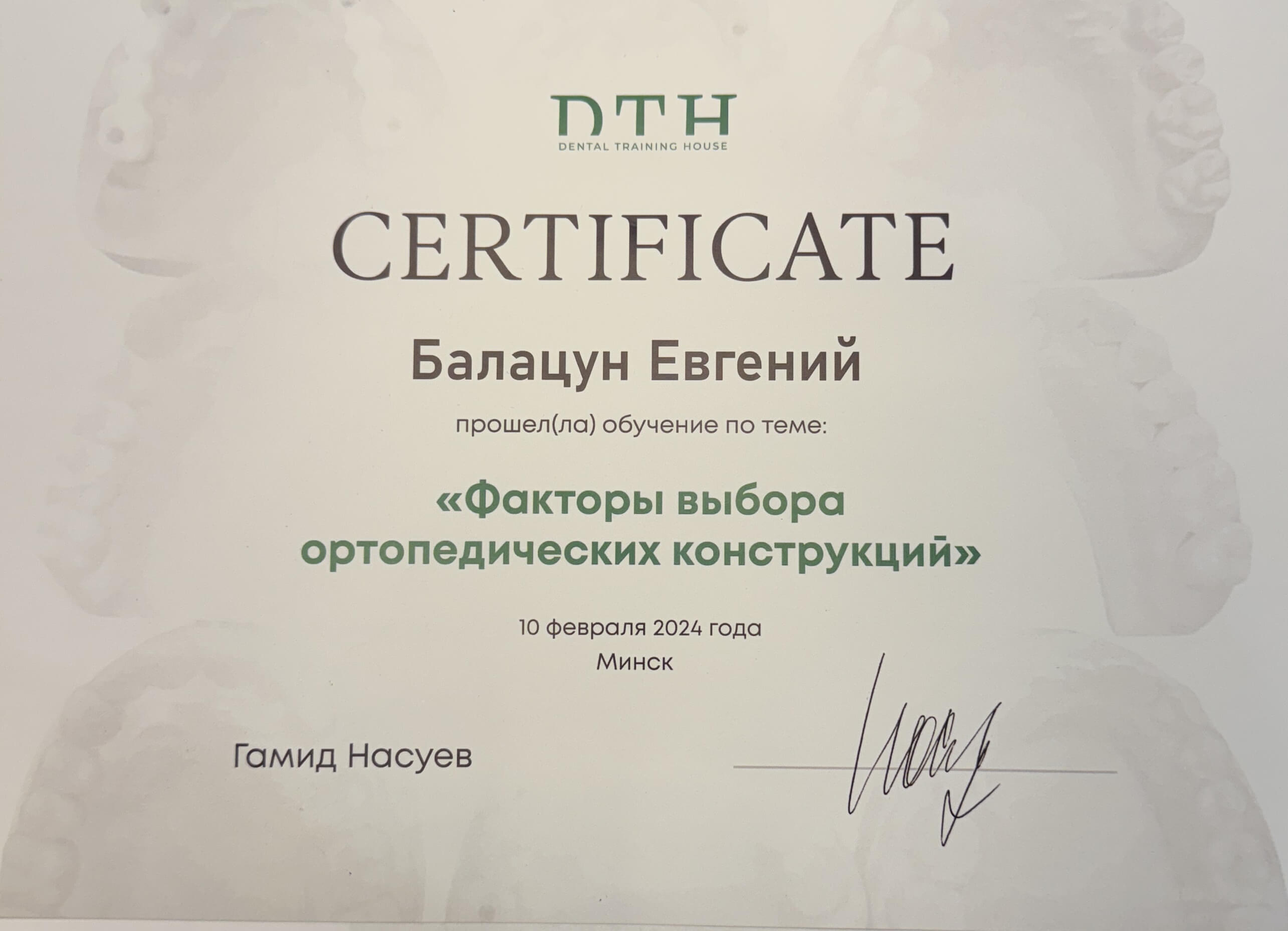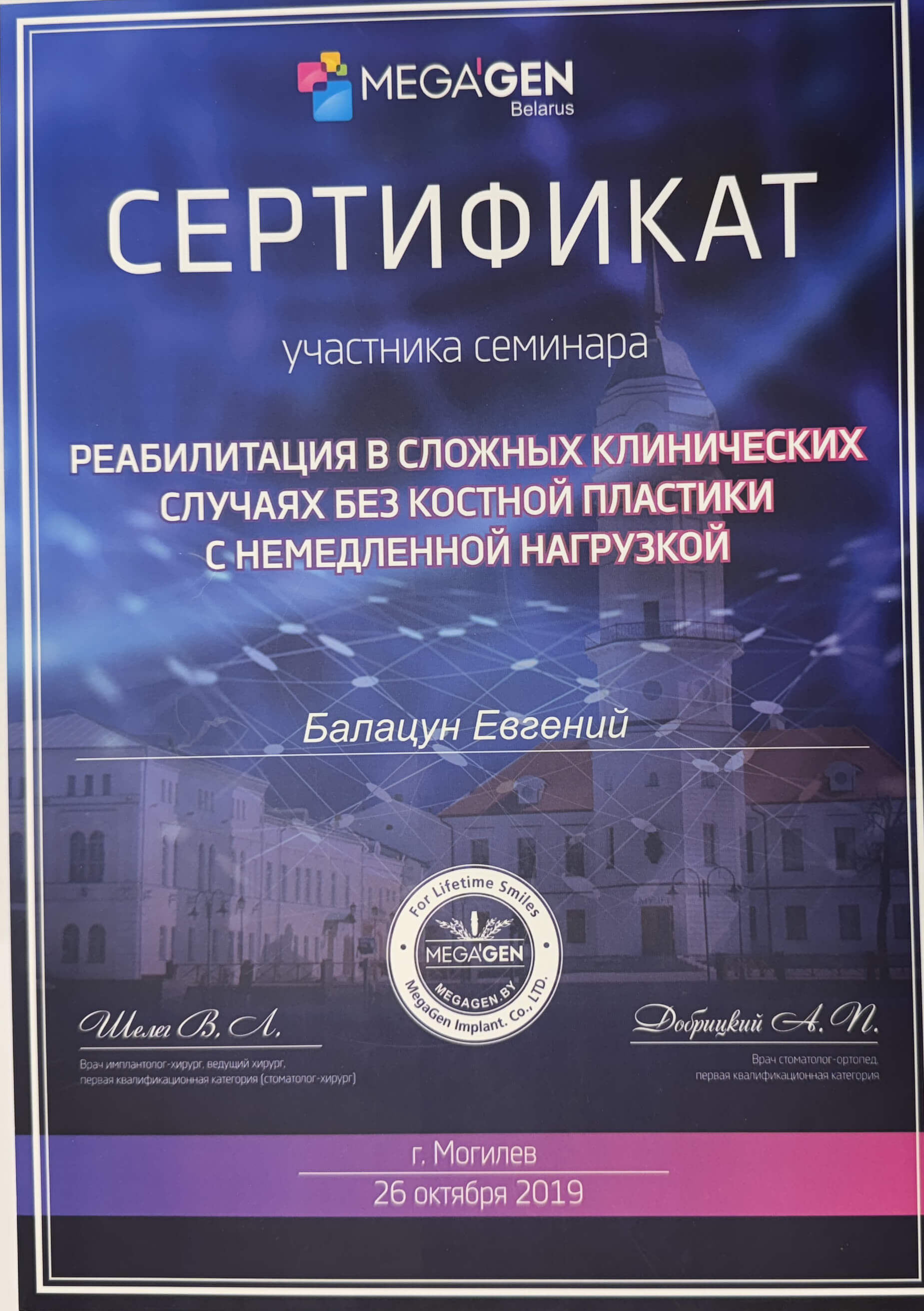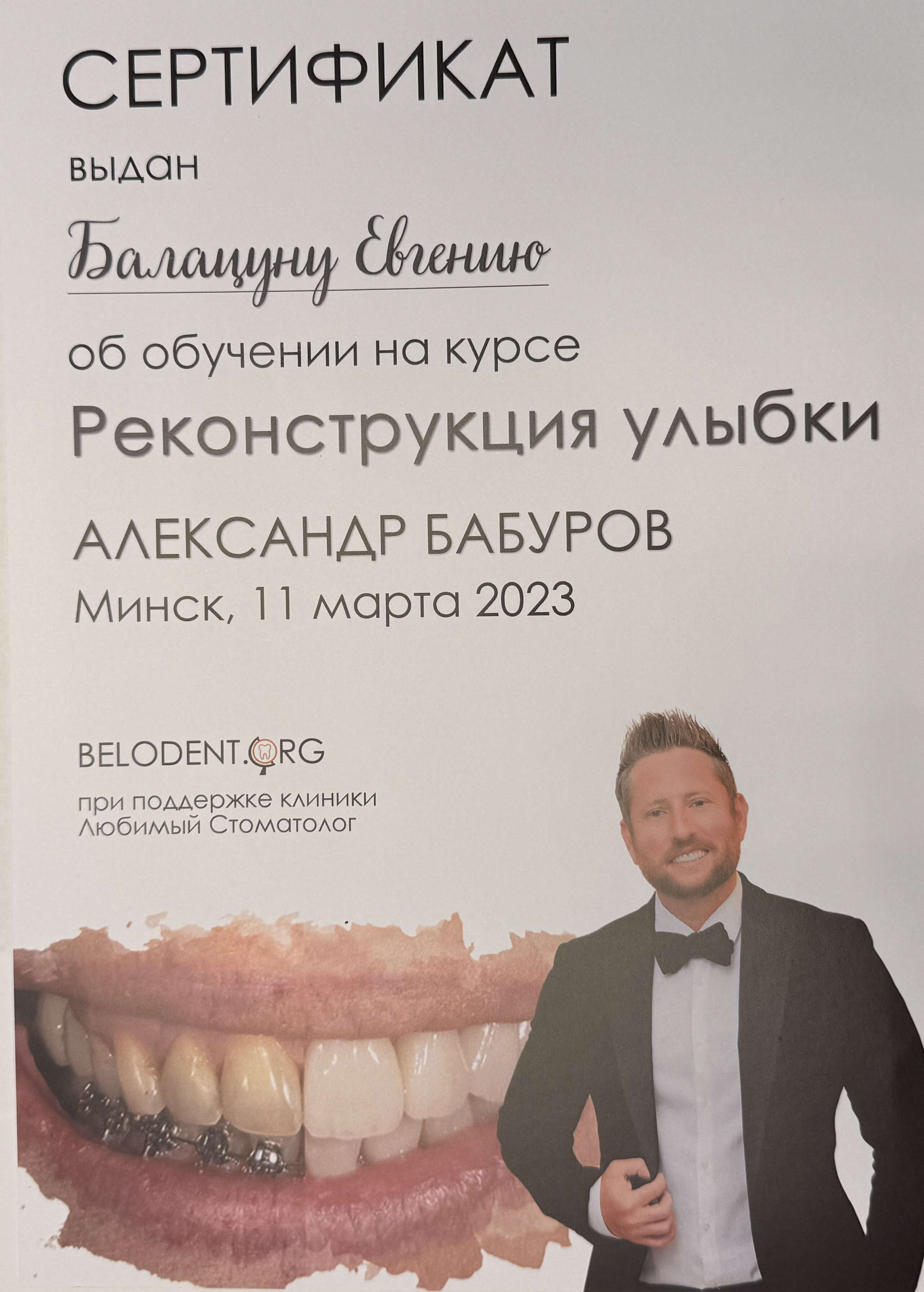 Записаться на консультациюБалацун Евгений Андреевич — практикующий врач стоматолог-ортопед с 2015 года, за это время работал в государственных и частных стоматологиях Минска. Профессиональный интерес врача — тотальная реабилитация пациентов с восстановлением физиологической окклюзии.